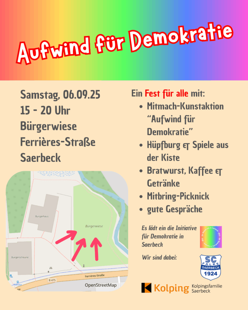 „Aufwind für Demokratie“ ist das Motto eines Festes für alle, zu dem die Initiative für Demokratie in Saerbeck einlädt.